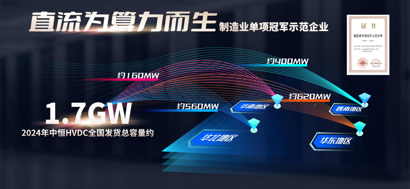 隨著人工智能技術的飛速發展,數據中心也面臨著前所未有的變革。HVDC技術以其高效、穩定的特性,能夠有效滿足數據中心對電力供應的高要求,為數據中心的穩定運行提供堅實保障。在過去的一年中,中恒電氣作為 HVDC供電方案的先行者,其技術與產品已迅速擴展至全國主要的算力核心區域。2024年累計裝機容量達到1.7GW,這不僅體現了數字上的規模,更象征著算力領域對直流技術的廣泛信任與深度認可。